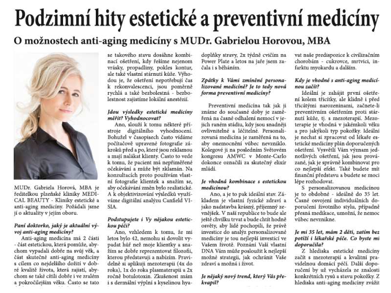 MUDr. Gabriela Horová, MBA je ředitelkou plzeňské kliniky MEDICAL BEAUTY - Kliniky estetické a anti-aging medicíny. Požádali jsme jí, aby se s námi podělila o nové trendy svého oboru.